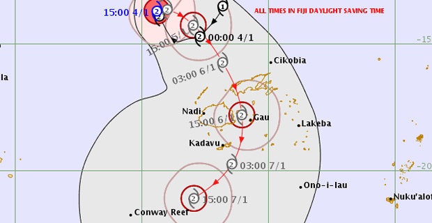 Singh says the centre of the cyclone is expected to close to Vanua Levu from midmorning tomorrow into tomorrow afternoon. On the forecast track, the centre is expected to be located about 300km north‑northwest of Yasawa‑i‑Rara or about 380km northwest of Nadi at 1pm today.