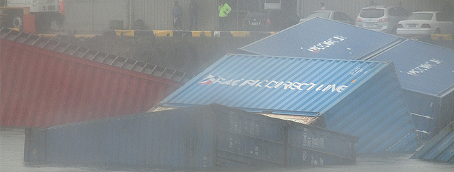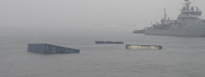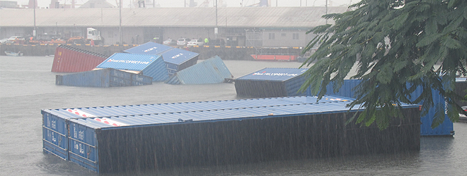 A number of cargo containers are also floating in the water just behind the Village Six Cinemas Complex.