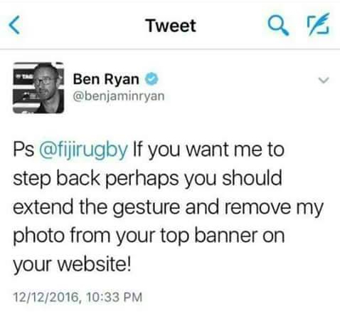 Ryan also tweeted "Ps @fijirugby If you want me to step back perhaps you should extend the gesture and remove my photo from your top banner on your website".