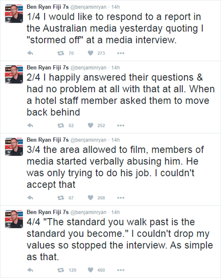 Vodafone Fiji 7s coach, Ben Ryan says the woman who is quoted in a news.com.au article that Ryan cut short a press interview with Ryan and Jarryd Hayne in London, is completely misinformed.