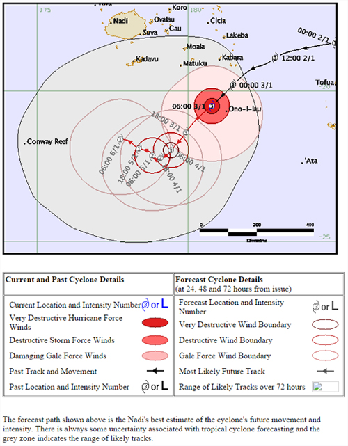Vatoa and Ono‑i‑lau should expect destructive storm force winds with average speed of 105km per hour and momentary gusts of 155km per hour.