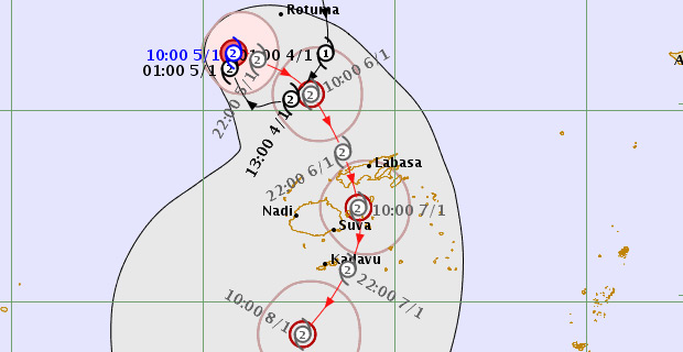 On the forecast track the centre is expected to be located about 330km North of Yasawa-i-rara or about 390km Northwest of Labasa at 1am tomorrow morning.